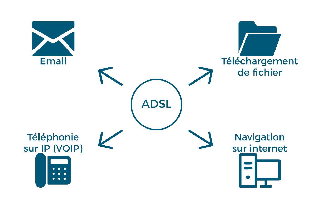 L’ADSL est un accès internet asymétrique : le débit consacré à la réception d’informations venant d’internet (débit descendant) est supérieur à l’émission de données par l’utilisateur (débit montant).